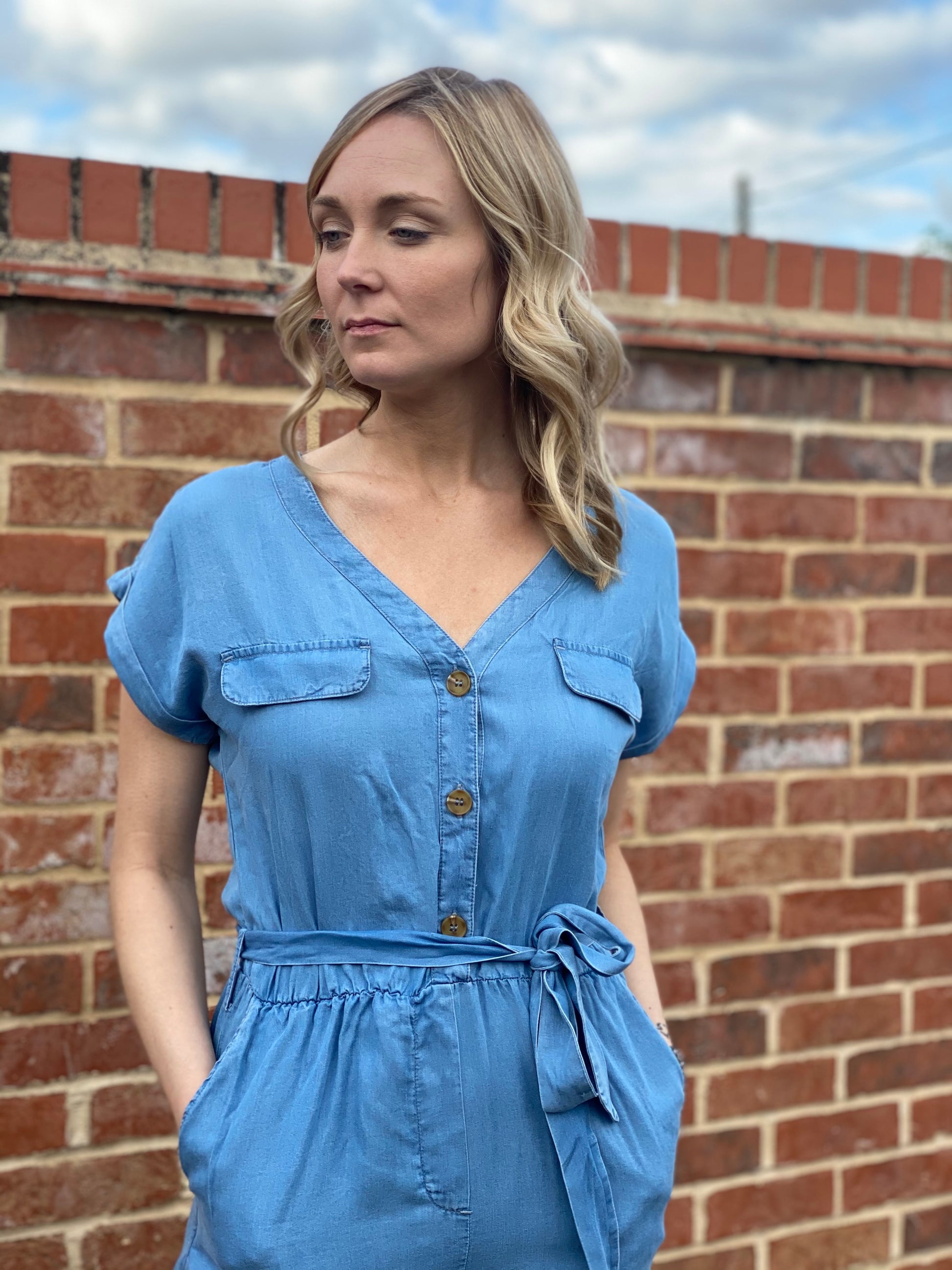 Want to be the cutest lady at the bbq? This is your go-to!!! The Allison belted chambray romper is adorable and the perfect fit for all heights! It's got a stunning v neck, a tie waist and is made of 100% Tencel material which means not only is this romper super cute, it's also insanely soft.