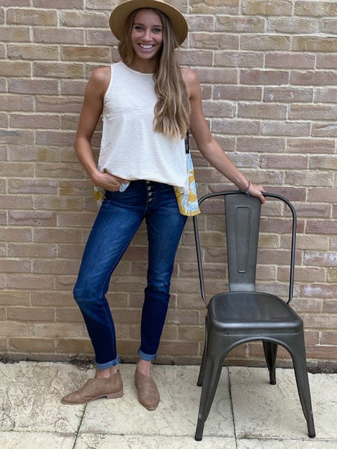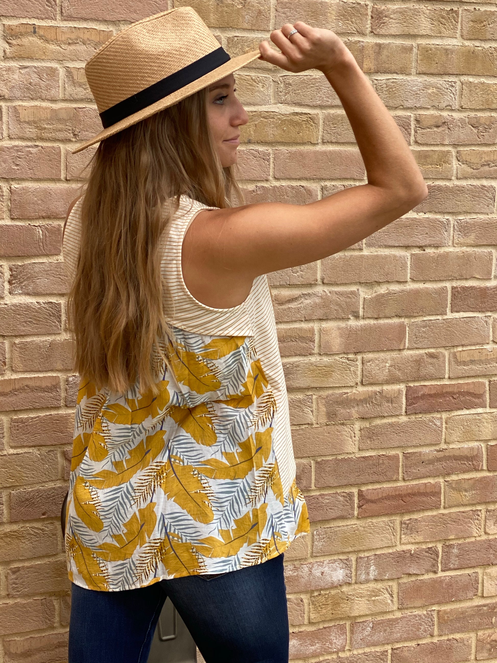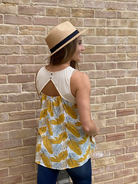 Leaves are falling and Yellow is the color of Autumn! đ The Amora top has a simple cream and yellow stripes on the front with yellow and different hues of blue leaf pattern wrapping from front to back. The back has a small opening on the back and gives it that sexy appeal, yet classy with the leaf pattern throughout.Â