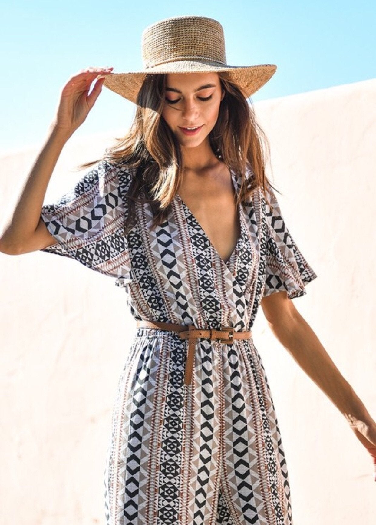 Who doesn't love a beautiful pattern? Our Aztec Jumpsuit has a beautiful pattern of blues and sandy colors, long and flowy to the floor, and has a stunning V neck.
