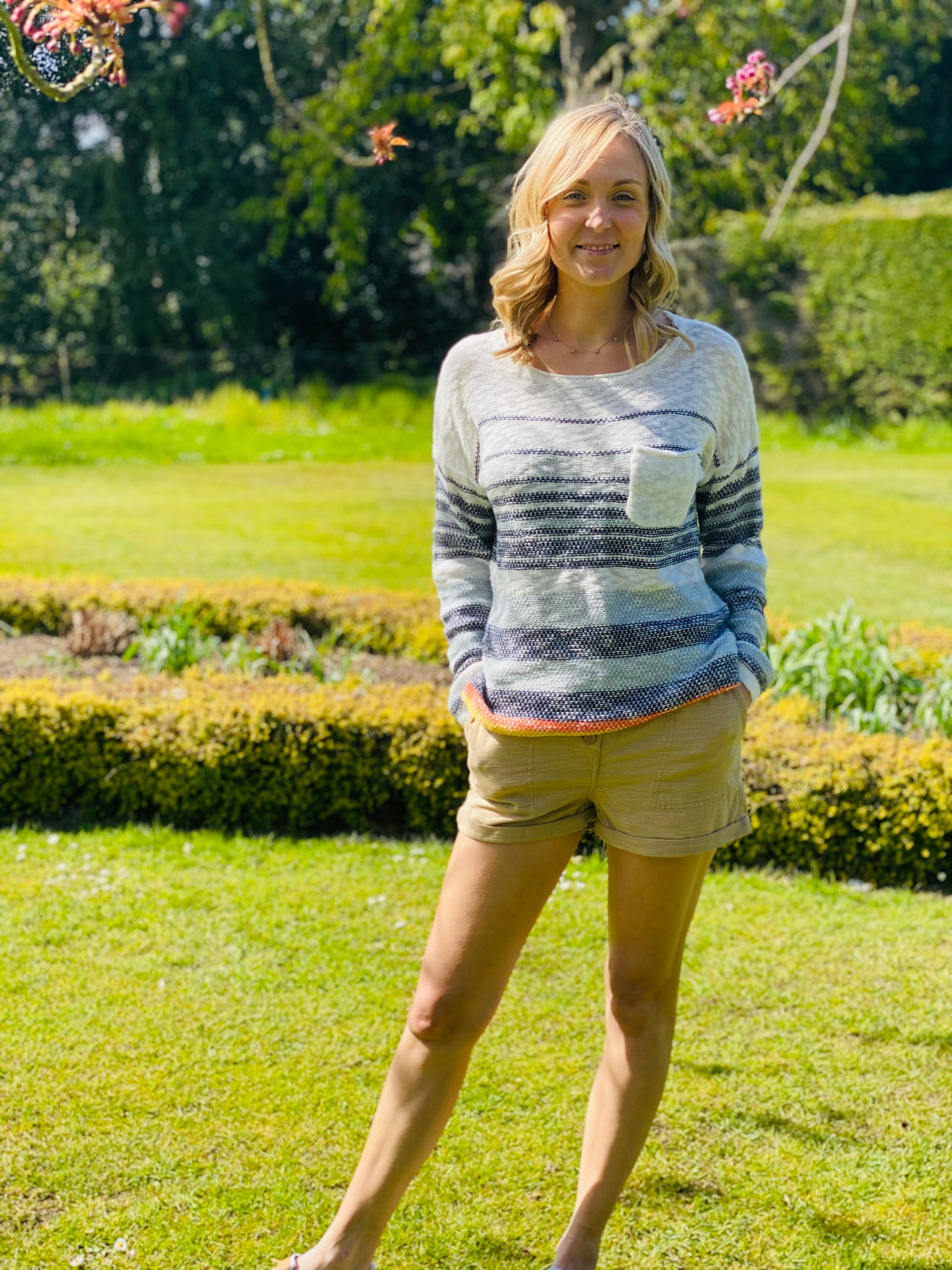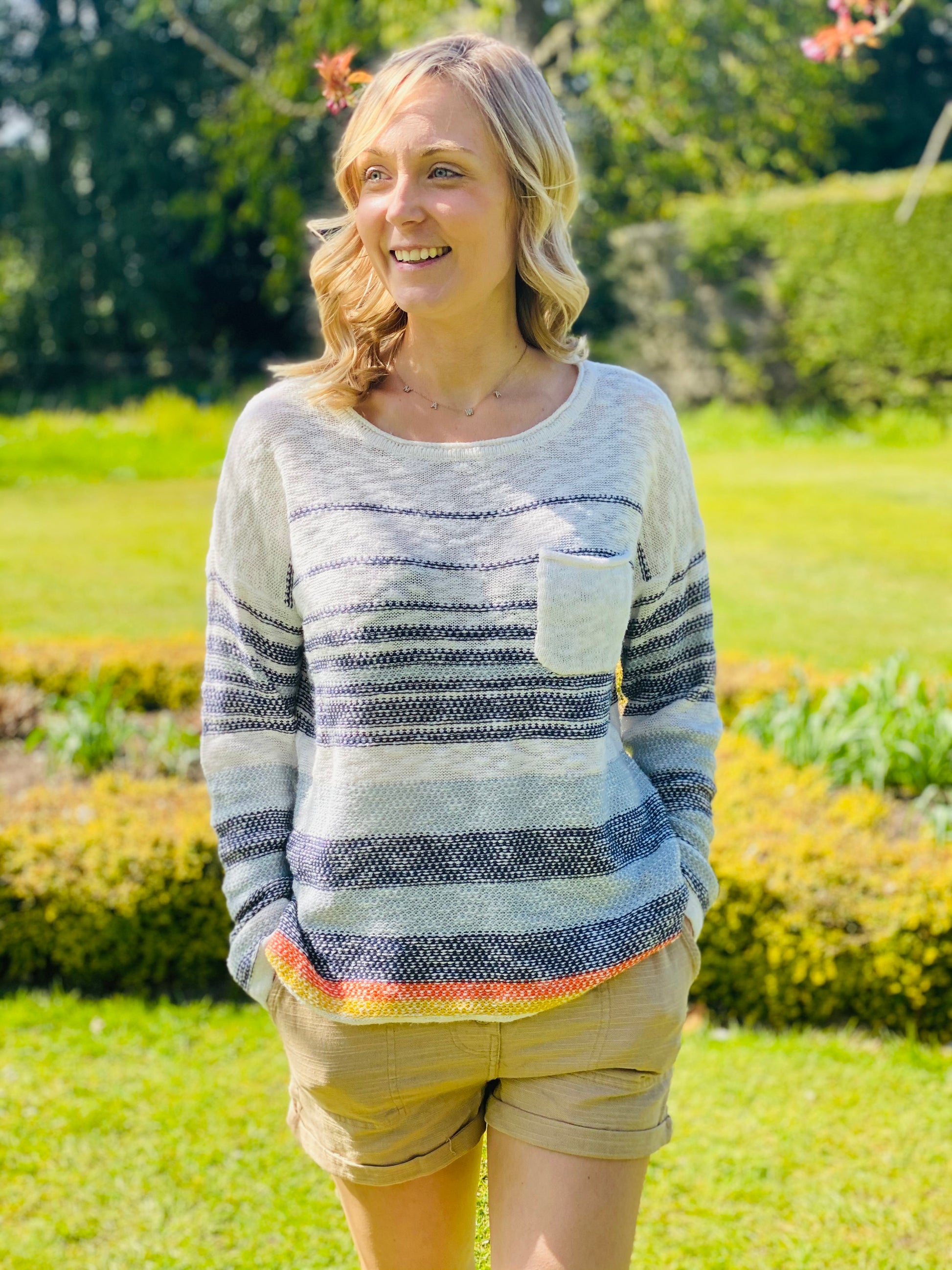 This sweater is perfect for any spring or summer evening! Very light knit and comfortable. This sweater is 100% cotton.