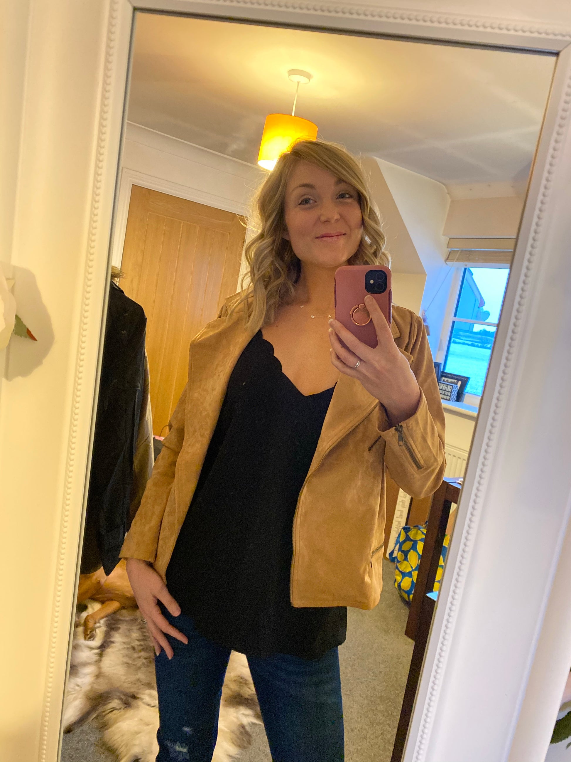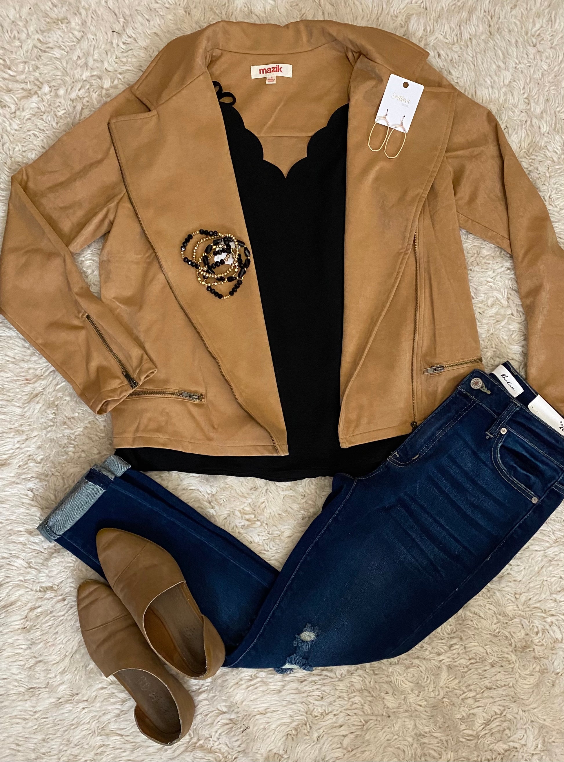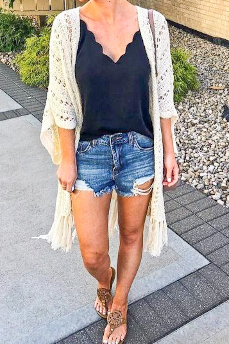 The perfect black tank is here. This black scalloped tank is so flattering, it lays perfect for all chest sizes and is a flowy fitting tank. It does not have adjustable straps, but fits true to size.