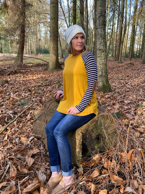The Blair Tunic is the perfect top to wear this holiday season; it works great with Kan Can jeans, leggings, or jeggings! It is a golden yellow with Navy and white stripe sleeves and the patched elbows.