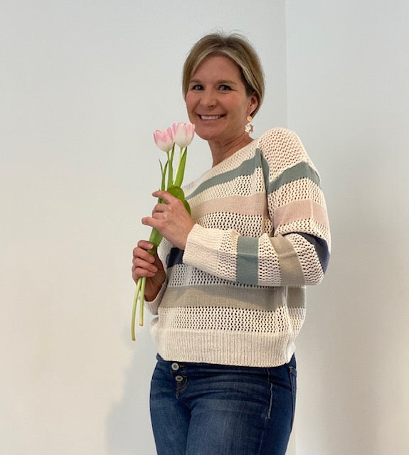 This sweater is the perfect amount of pastel stripes, light knit and the must-have of the spring season. The length sits just above the belt line and is a fabulous top to throw on all season long!!