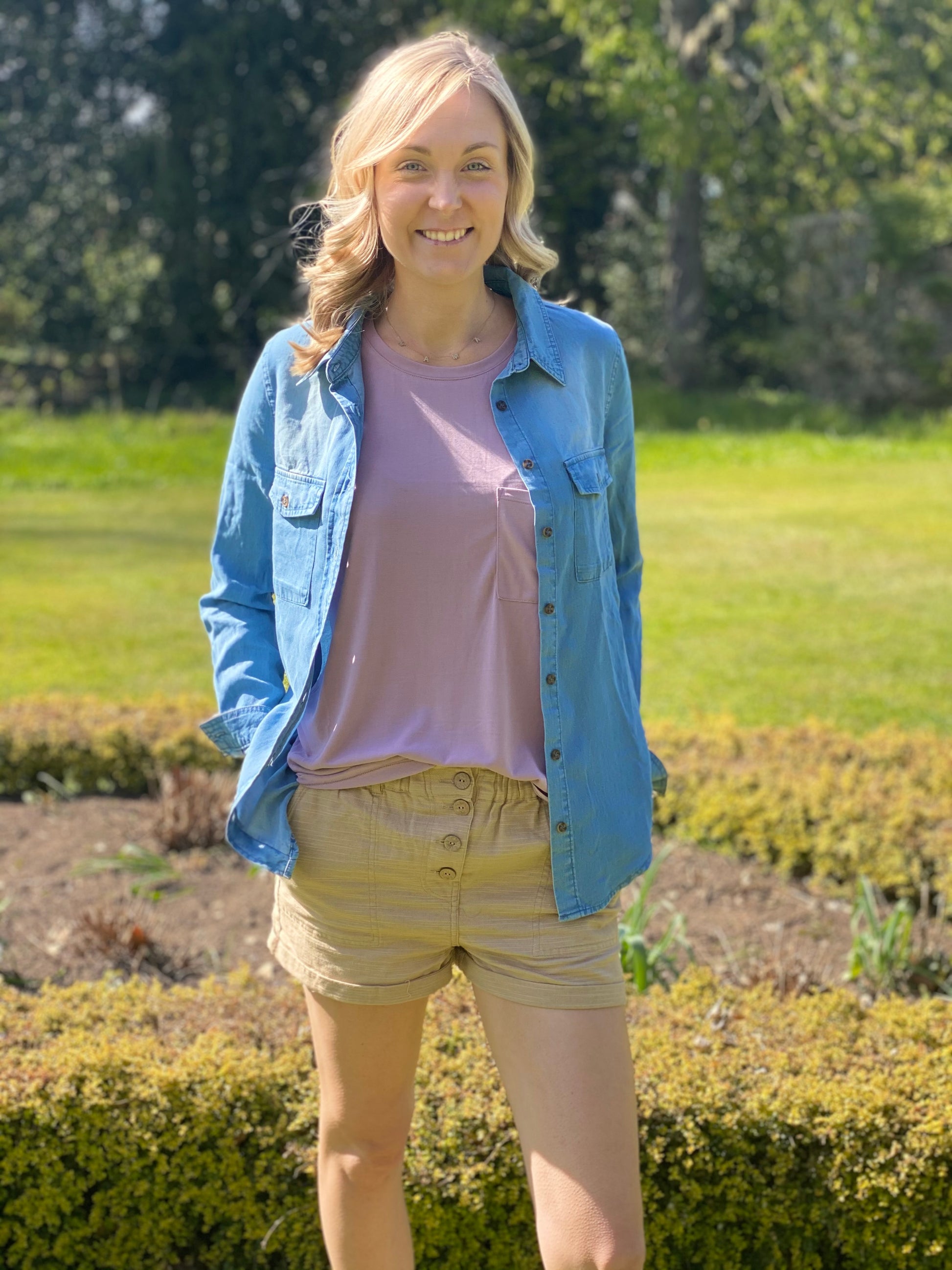 This is our Desert tank making a come back in Easter Lavender...It is super soft and flowy!! We love the character of the small pocket feature on the front and that it has a longer front and back.
