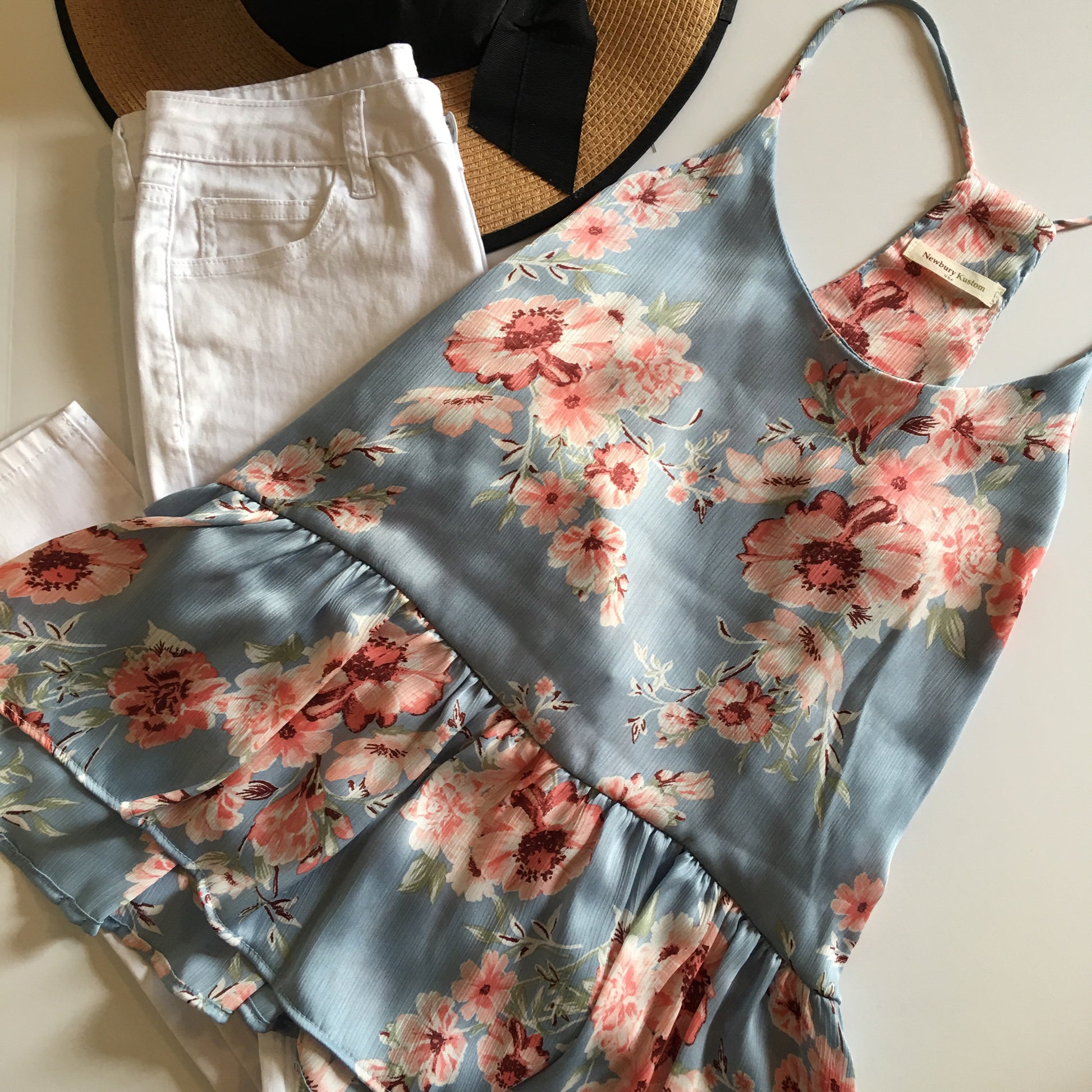 The Floral Peplum silky top is beautiful and flirty! The perfect top to pair with white skinny jeans and super cute wedges! It has a razorback and lightweight fabric that makes this top super flattering. It fits true to size and the bust is lined.