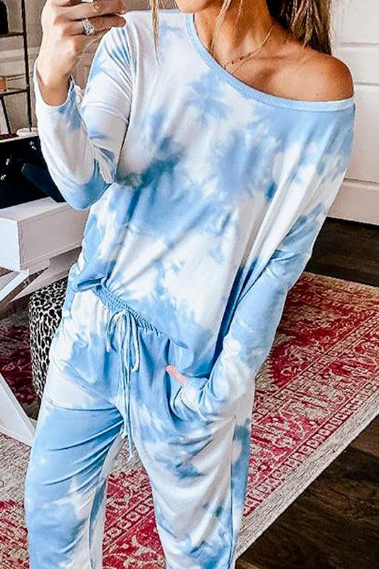 "Into the Clouds" is exactly how you will feel when you put this lounge wear set on...it's sky blue, loose casual fit tye-dyed set with drawstring waste. The fabric is 55% cotton, 25% polyester and 20% rayon, super soft and snuggly.