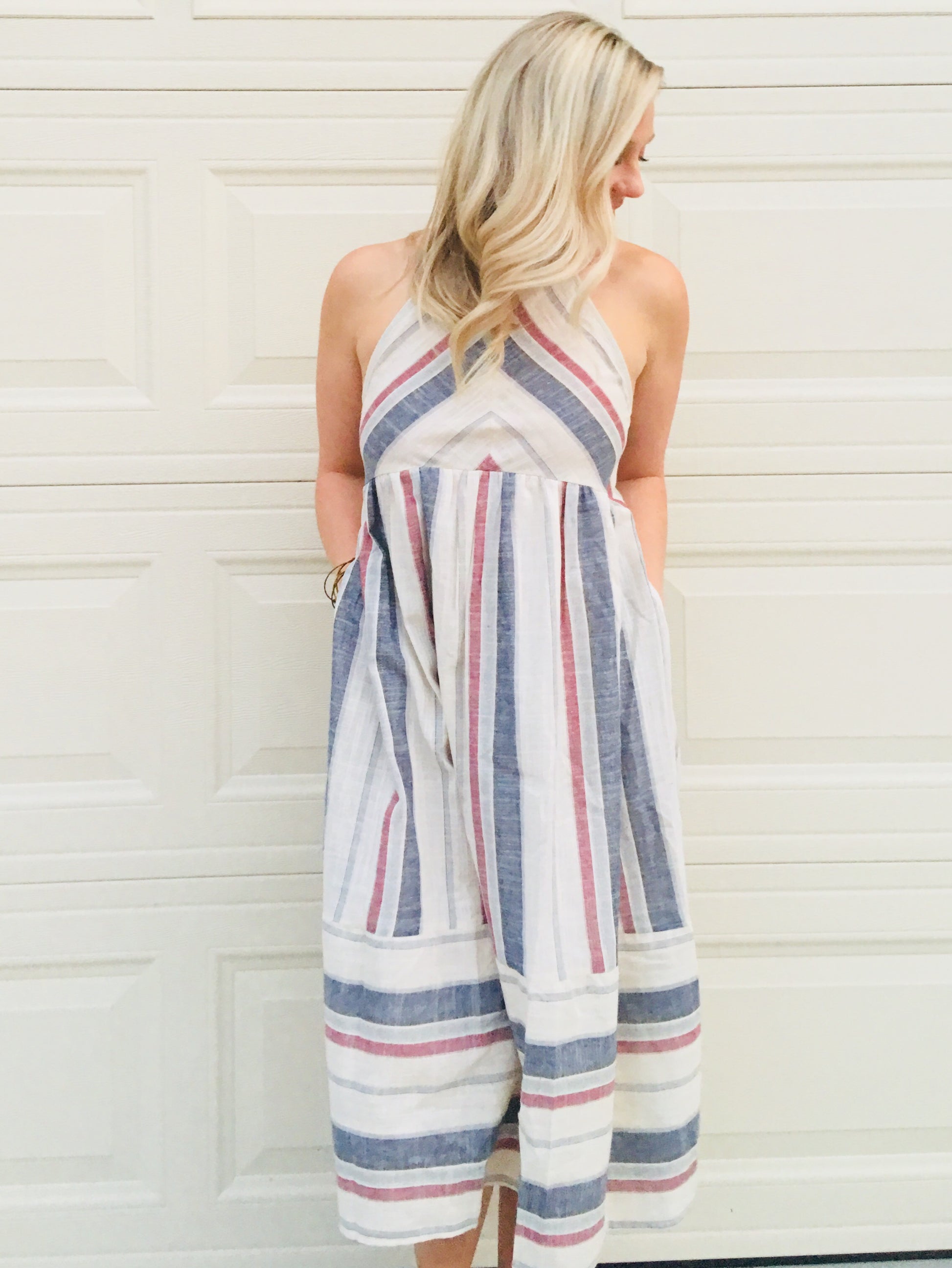 We love everything about this dress! It has a super flattering silhouette, pockets and is 100% Cotton. It has a fully lined skirt, halter neckline with a keyhole button in the back. I