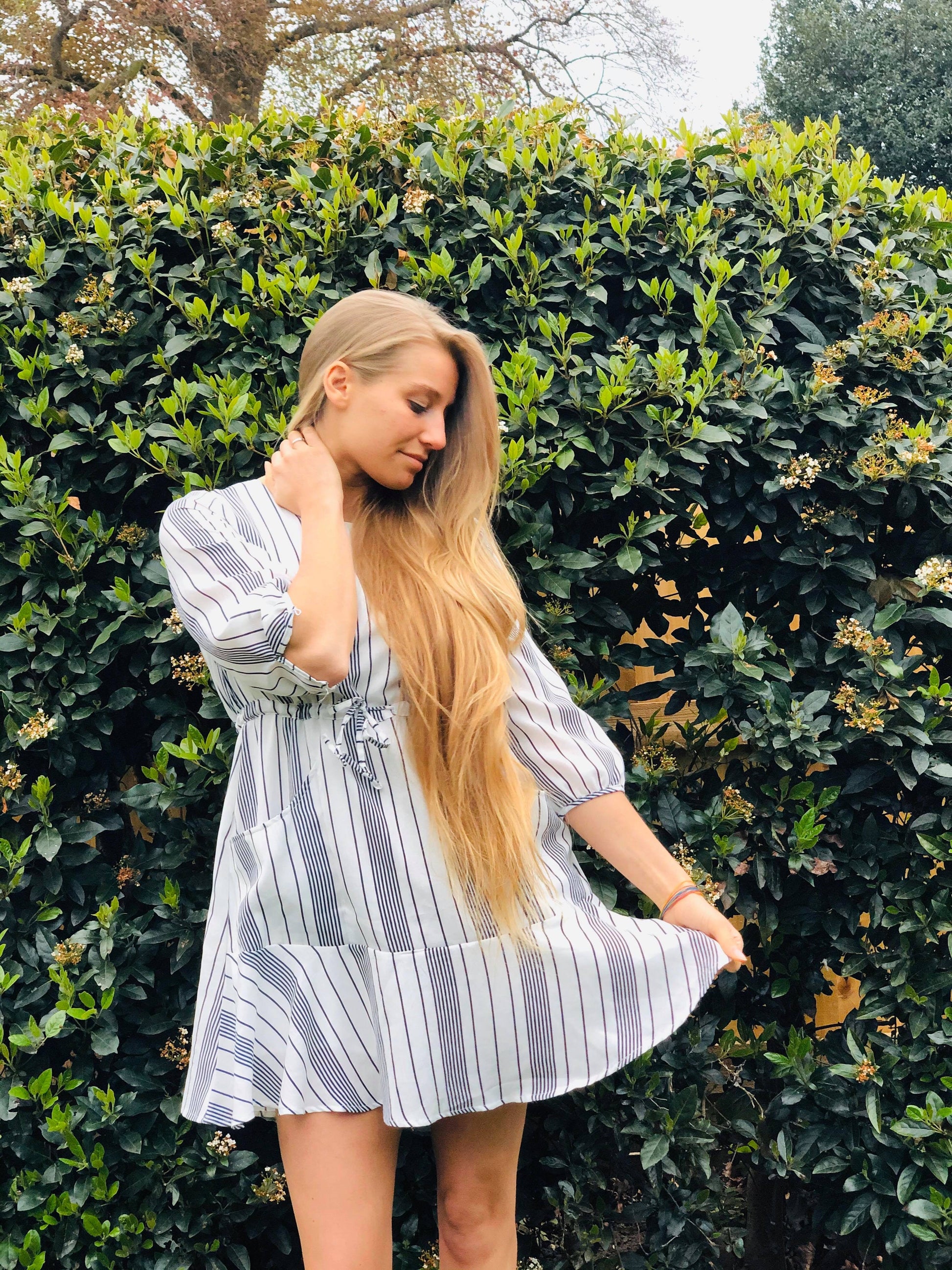 Our navy and white striped woven dress features a round neckline, 3/4 sleeves, a drawstring waist, front pockets, ruffle hem, and back button closure with keyhole detail! It's super soft and and is not sheer.