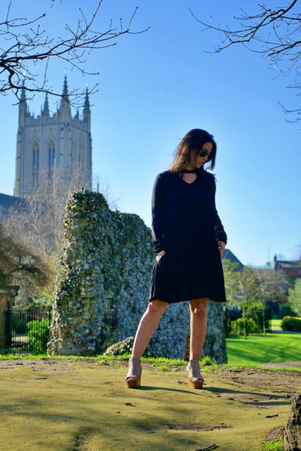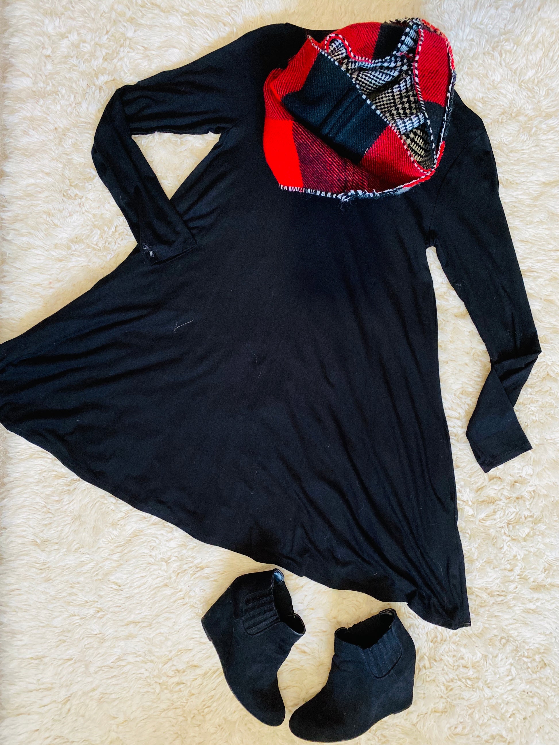 Everyone needs a simple black dress...let this be yours. We love the cut of this dress and the elegant flow it has; this dress is not clingy and is super comfortable. This everyday black dress paired with our black and red houndstooth scarf is a must-have outfit this holiday season.