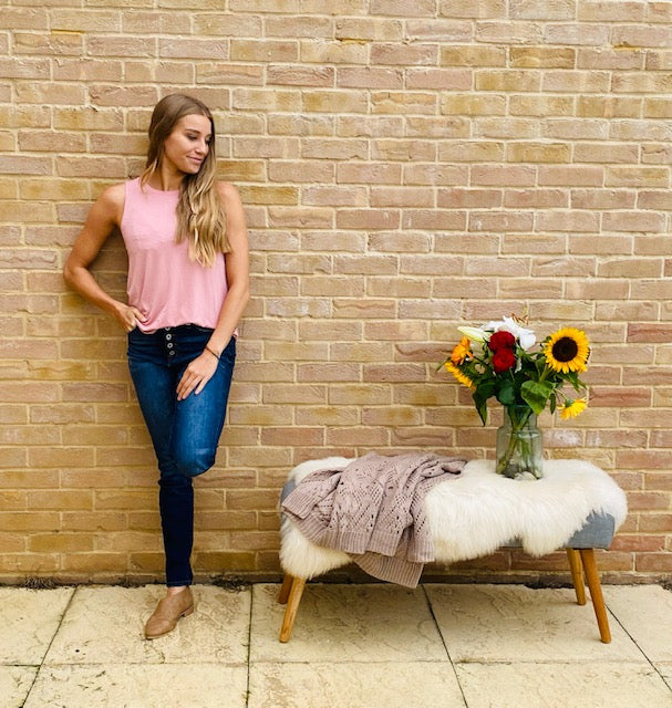 We love the material of this tank it is extremely soft and lays flat and if you hate to iron, hang dry this tank and wa-la wrinkle-free! :) It is a really pretty desert rose pink color and goes perfect with our new Khaki Lennon button shorts. This is a breathable material and fits true to size.