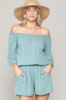 This romper is a must have for anyone’s closet!!! What a gorgeous color, simple print, and the best off the shoulder...it doesn’t ride up! And...it has pockets!! We love that it has elastic around the middle that gives everyone the perfect look!!
