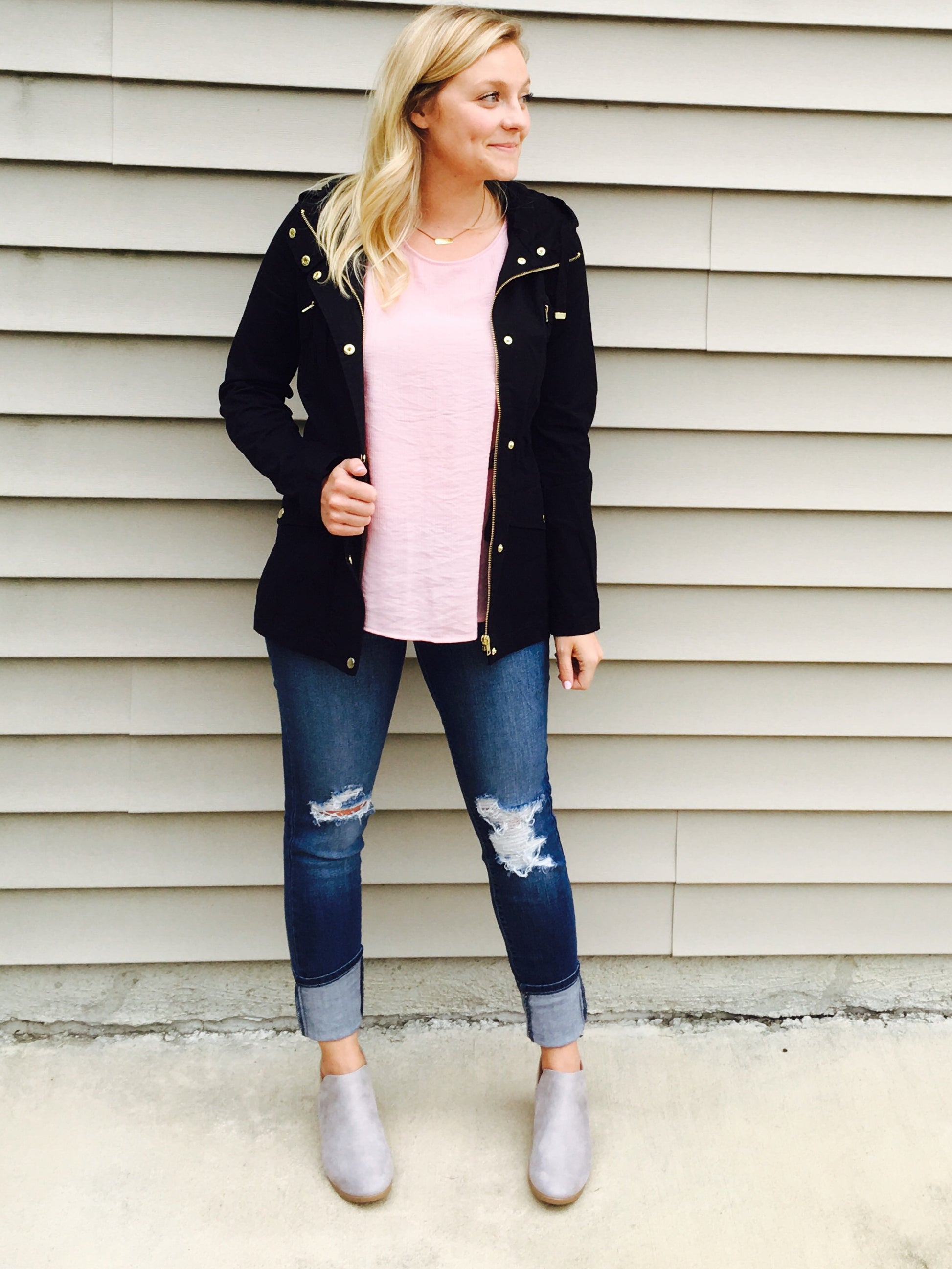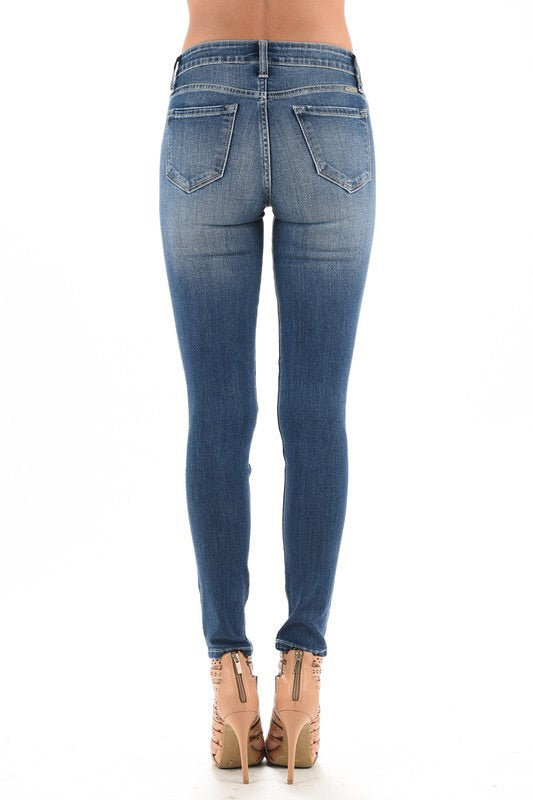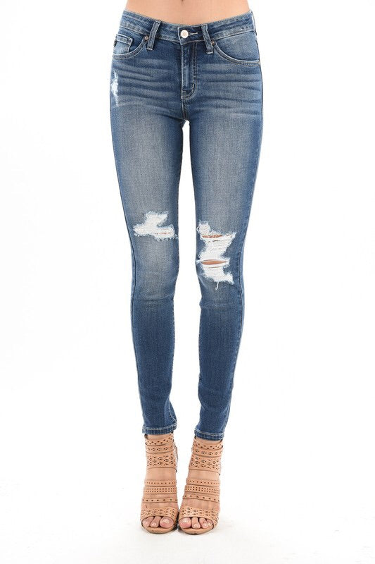 We love these jeans! The stretch and distressed denim make them the perfect go to jean. They're a more high waist fit, which makes them super comfortable!