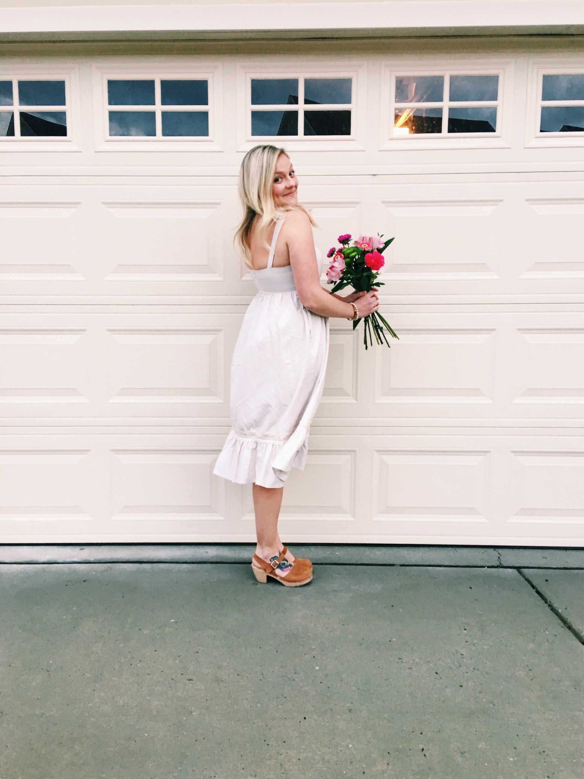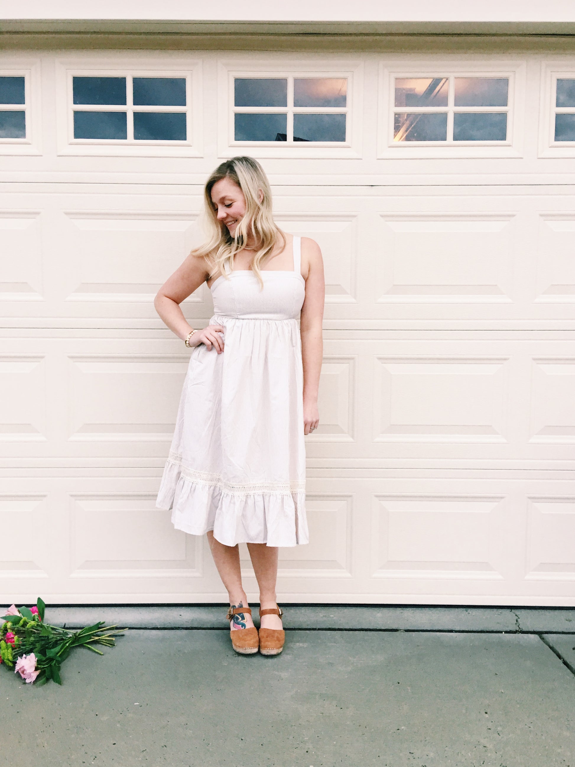 This off white subtly striped dress is so feminine! I love the empire waist silhouette and the crochet detail around the ruffle bottom. It has a zipper in the back and pockets!