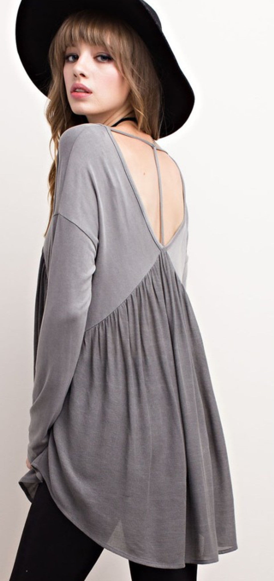 The Jenna top has a stunning V neck front, with unique criss-cross back and comes in a beautiful grey color. It has a flattering empire waist, and flowy bottom; you can pair this beauty with jeans or leggings and a cute pair of booties.